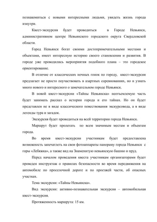Документ описывает новую автомобильную квест-экскурсию по Невьянску под названием «Тайны Невьянска», созданную для знакомства с историей города и воспитания патриотических чувств. Экскурсия включает активное движение на автомобиле, уникальные задания и легенды, позволяющие участникам изучить значимые места и тайны Невьянска. Продолжительность экскурсии составляет от 4 до 6 часов, маршрут охватывает ключевые достопримечательности города.