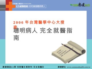该文档提供了一份关于台湾各大医学中心医生和科室特色的详细指南,涵盖心脏、神经、胃肠、泌尿、妇科、儿科等领域。通过收集专家意见和医疗统计数据,读者可以找到适合自己病情的医生,并了解各医疗机构的专业能力。文档强调了如何成为一个聪明病人,以确保更好的就医体验和沟通。