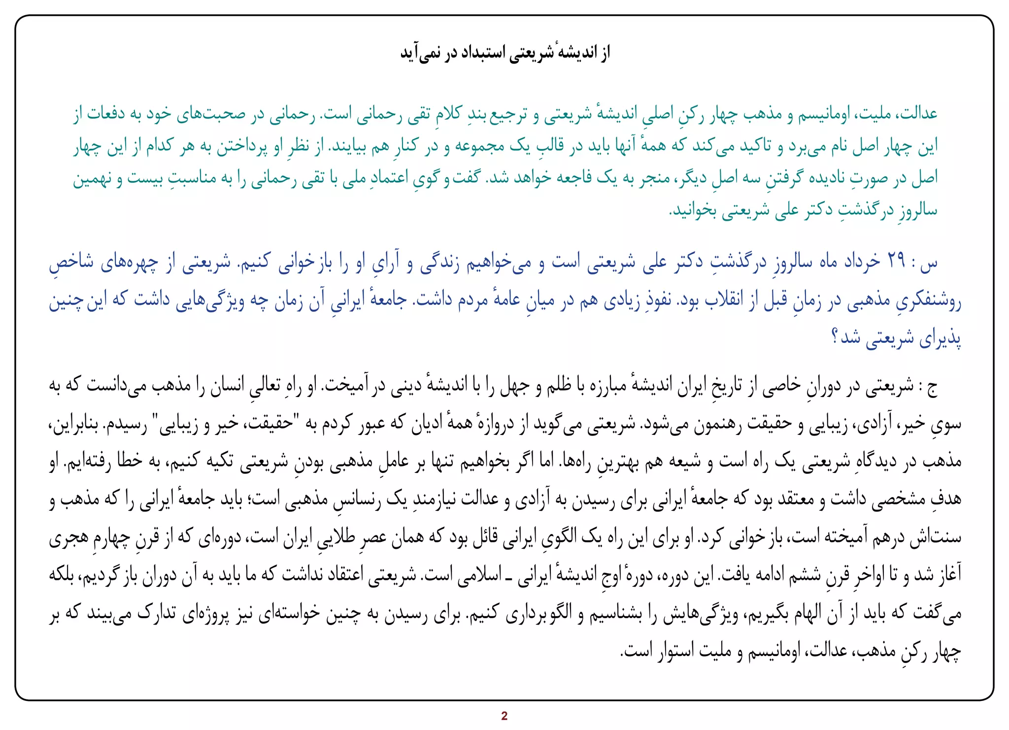 نخست مذهب را به عنوان یکی از ارکاناش قرار میدهد و به تبعیت از آنکه جامعه ایرانی شیعه مذهب است، میخواهد شیعه را باز خوانی کند.