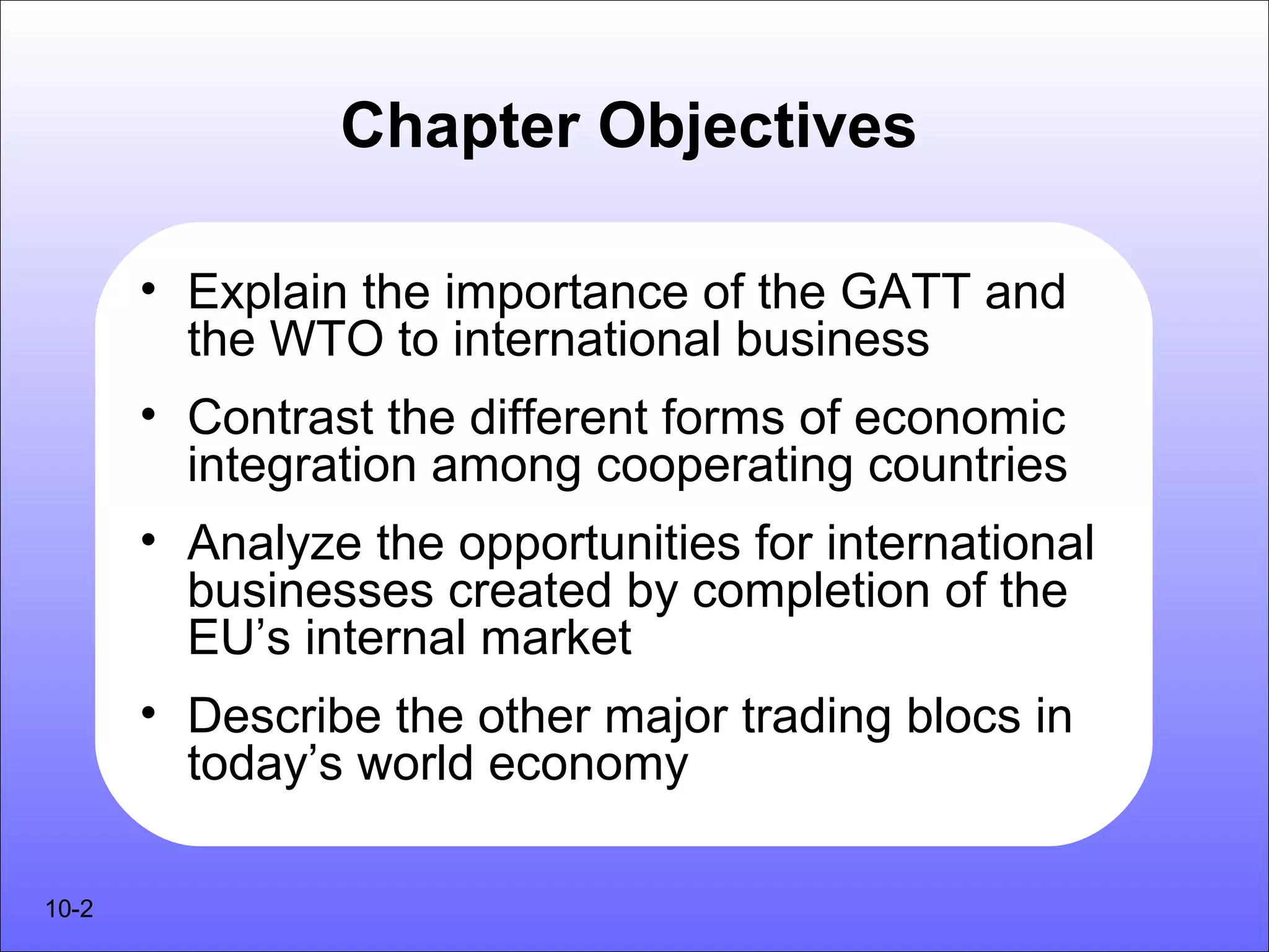 The document discusses international trade organizations and economic integration efforts among nations. It covers the establishment of the General Agreement on Tariffs and Trade (GATT) and its evolution into the World Trade Organization (WTO), including their goals of promoting free trade. Major trading blocs discussed include the European Union, NAFTA, ASEAN, and agreements in Africa and South America. The stages of economic integration, from free trade areas to political unions, are also outlined.