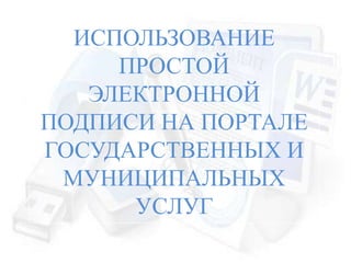 Документ описывает использование простой электронной подписи (ЭП) на портале государственных и муниципальных услуг России. Простая ЭП подтверждает личность подписавшего информацию с помощью кодов и паролей, позволяя авторизовываться на портале и подавать заявки на услуги. Приведён пример получения информации о рынке труда в Забайкальском крае с использованием простой ЭП.