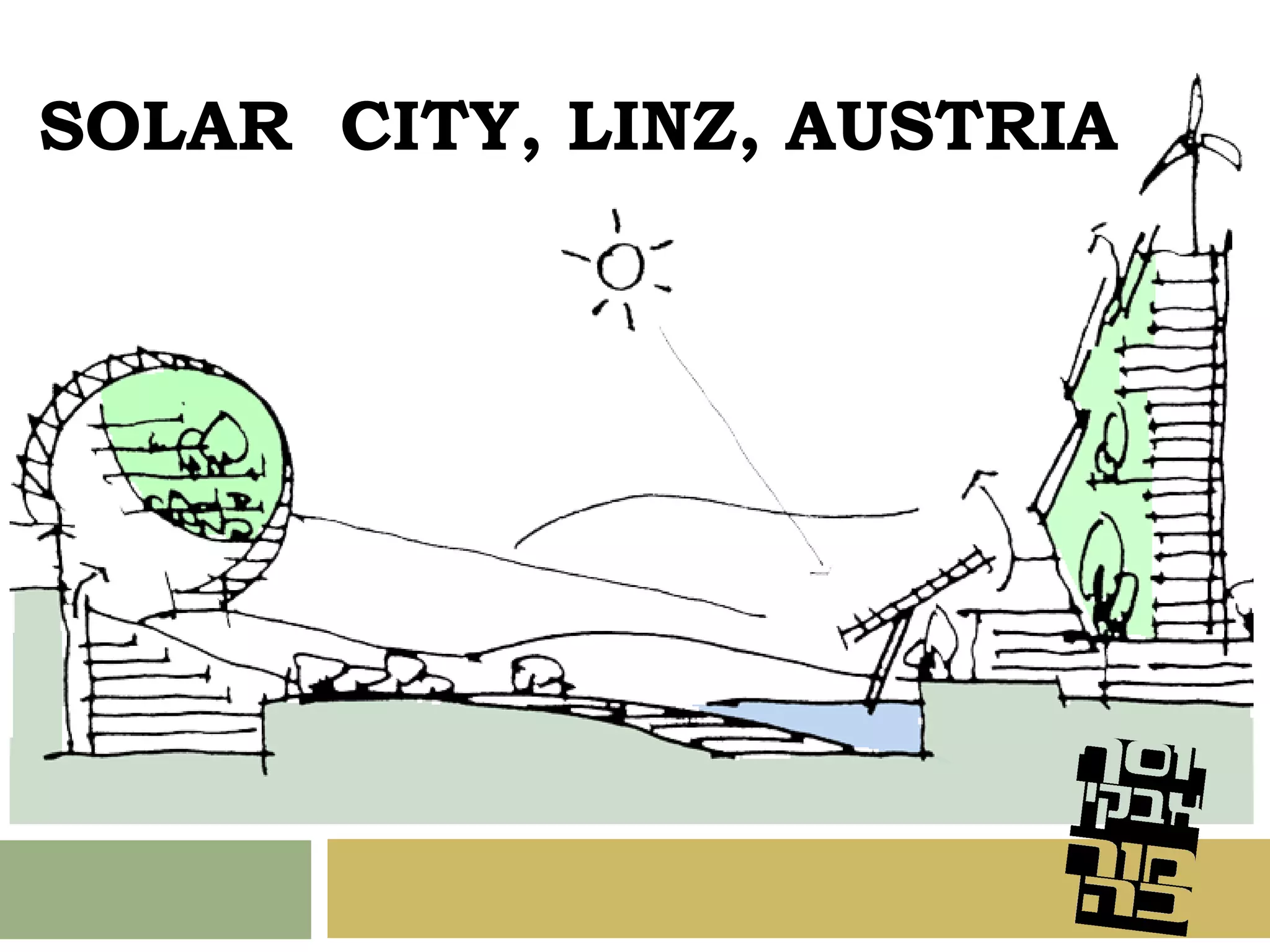 יישום ערכים לתכנוןבר קיימא תכנית כללית ותחבורה עיצוב הבניין וחומרים קהילה יישום אמצעים סביבתיים שטחים פתוחים מים ואשפה מורפולוגיה אורבאנית ביקורת ומסקנות צורה אורבאנית פרדיגמה תכנונית קהילה אמצעים סביבתיים - אנרגיה - אספקה עצמית של החשמל דרך שימוש רחב בלוחות סולאריים ואמצעים שונים לחסכון בחשמל ואף ליצירת רווח . עדיפות לבנייה צפופה יותר בכיוון דרום . אוורור ותאורה טבעית , בידוד גבוה , אגירת חום . מערכות פאסיביות לחימום מים . אלמנט איוורור חיצוני צינורות אוורור