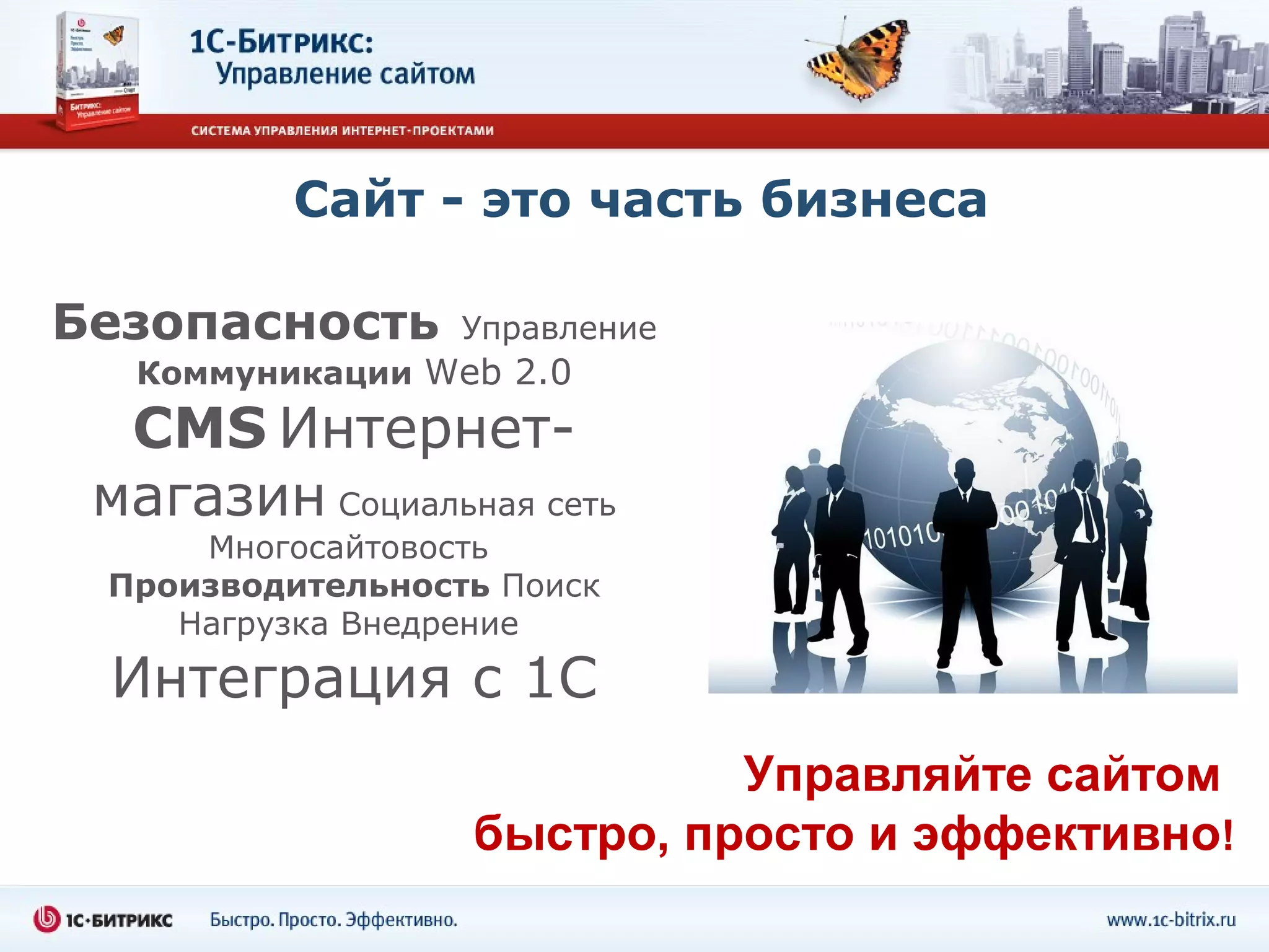 Документ представляет собой детальное описание системы управления сайтами '1С-Битрикс', которая включает в себя функционал для создания и управления разнообразными интернет-проектами, такими как интернет-магазины и корпоративные сайты. Он освещает ключевые функции, такие как безопасность, многосайтовость, интеграция с 1С и SEO-инструменты, а также возможности управления контентом и взаимодействия с пользователями. Система также предлагает широкий спектр инструментов для автоматизации бизнес-процессов, е-коммерции и обслуживания клиентов.