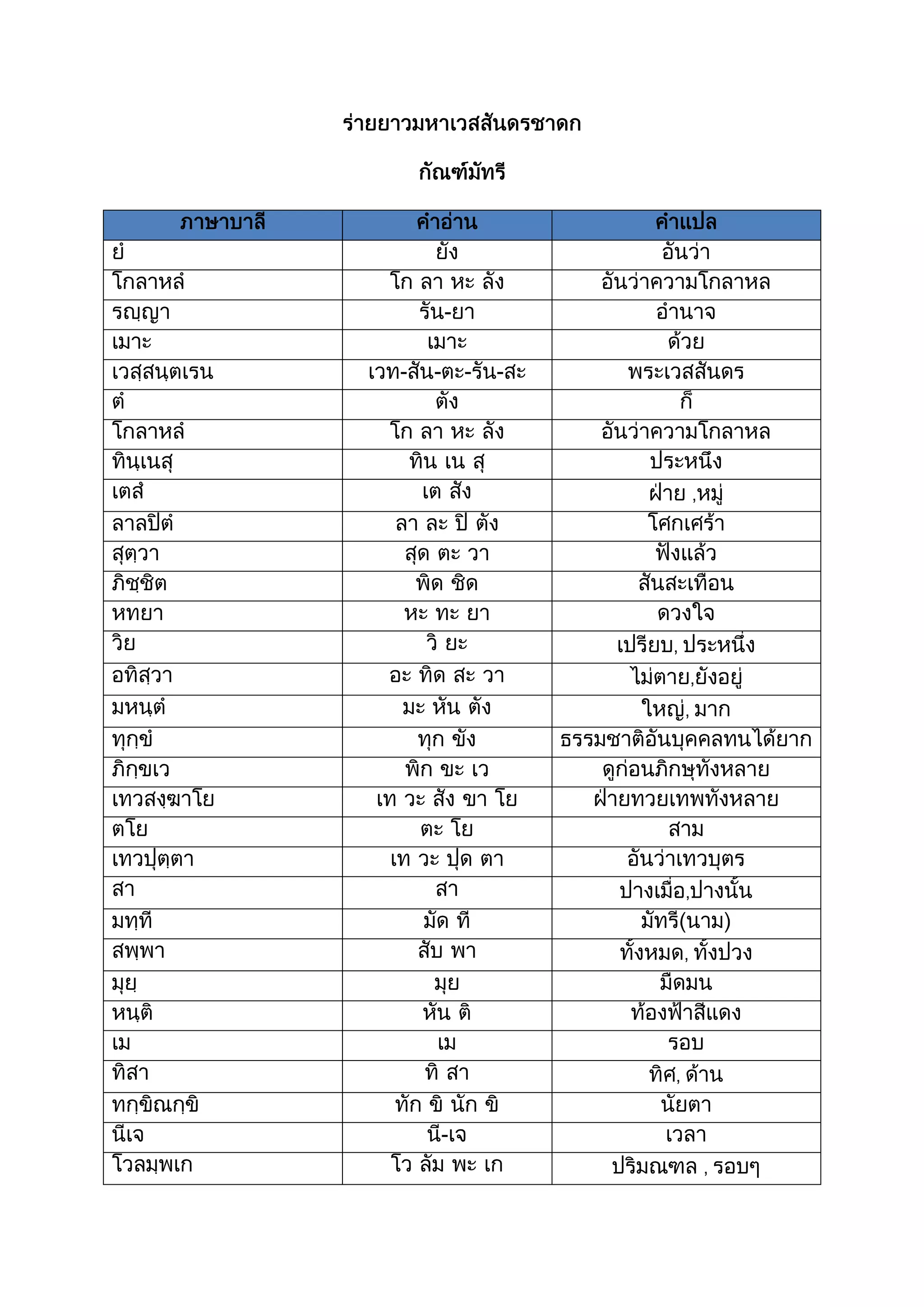 ศัพท์บาลี ร่ายยาวมหาเวสสันดรชาดก ตอน กัณฑ์มัทรี