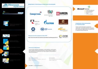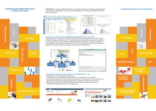 Документ описывает внедрение информационных систем управления проектами, включая MS Project и Turbo Project, в строительных и проектных организациях с учетом российской специфики. Он подчеркивает важность оптимизации процессов и выстраивания коммуникаций для повышения эффективности управления проектами и снижения рисков. Также представлены контакты для получения дополнительной информации и запросов на демонстрацию решений.