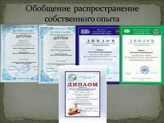 Документ представляет собой презентацию опыта работы учителя русского языка и литературы Светланы Владимировны Карась, которая имеет 21-летний стаж и высшее образование. Основные направления её педагогической деятельности включают инновации в обучении, воспитание творческой индивидуальности учеников и участие в олимпиадах и конкурсах, где её ученики показывают высокие результаты. Важные аспекты работы связаны с духовно-нравственным воспитанием, развитием доброты и умением строить отношения в классе и семье.