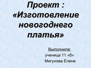 Документ описывает проект по изготовлению новогоднего платья ученицей 11 класса Еленой Мигуновой. Она создала короткое, приталенное платье с красивым бантом, использовав 1,5 метра шёлковой ткани и другие материалы, потратив в общей сложности 410 рублей. Елена довольна результатом, так как платье соответствует её ожиданиям и является воплощением её мечты.