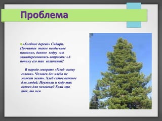 Исследование посвящено сибирскому кедру, известному как 'хлебное дерево', и его значимости для человека. В ходе работы были выявлены полезные свойства всех частей кедра: орехи, хвоя и древесина, а также его влияние на здоровье и экосистему. Гипотеза о важности кедра для жизни человека была подтверждена.