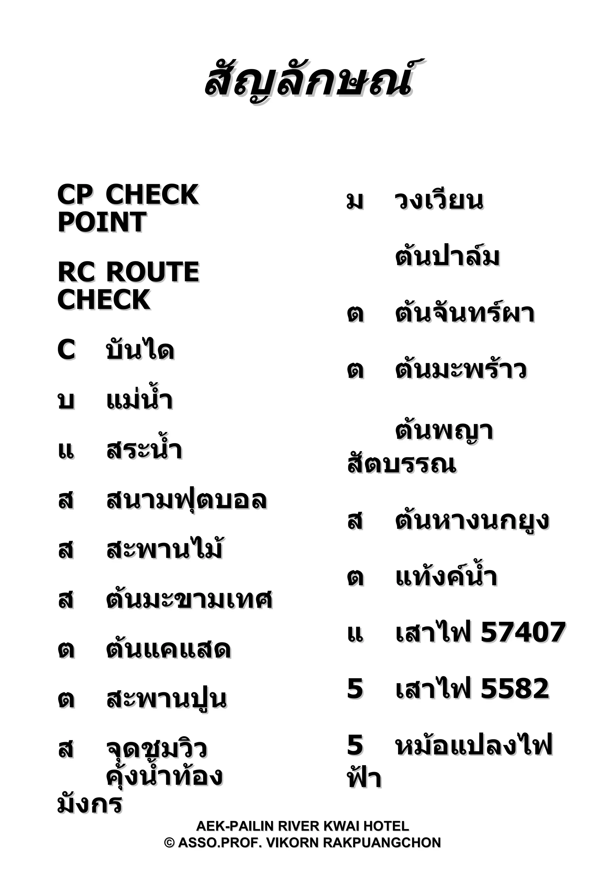 POINT RC ROUTE CHECK บันได แม่น้ำ สระน้ำ สนามฟุตบอล สะพานไม้ ต้นมะขามเทศ ต้นแคแสด สะพานปูน จุดชมวิว คุ้งน้ำท้องมังกร วงเวียน ต้นปาล์ม ต้นจันทร์ผา ต้นมะพร้าว ต้นพญาสัตบรรณ ต้นหางนกยูง แท้งค์น้ำ เสาไฟ 57407 เสาไฟ 5582 หม้อแปลงไฟฟ้า AEK-PAILIN RIVER KWAI HOTEL © ASSO.PROF. VIKORN RAKPUANGCHON