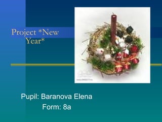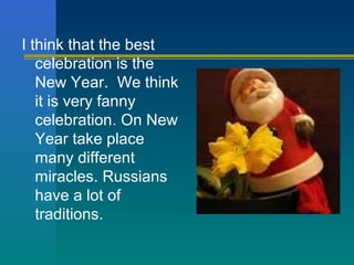 The document discusses Russian traditions celebrated on New Year, including decorating a fir tree together as a family, the tradition of Ded Moroz who children write letters to for gifts, his granddaughter Snegyrocka who knows many songs, and ending with fireworks displays in cities, which can be beautiful but dangerous.