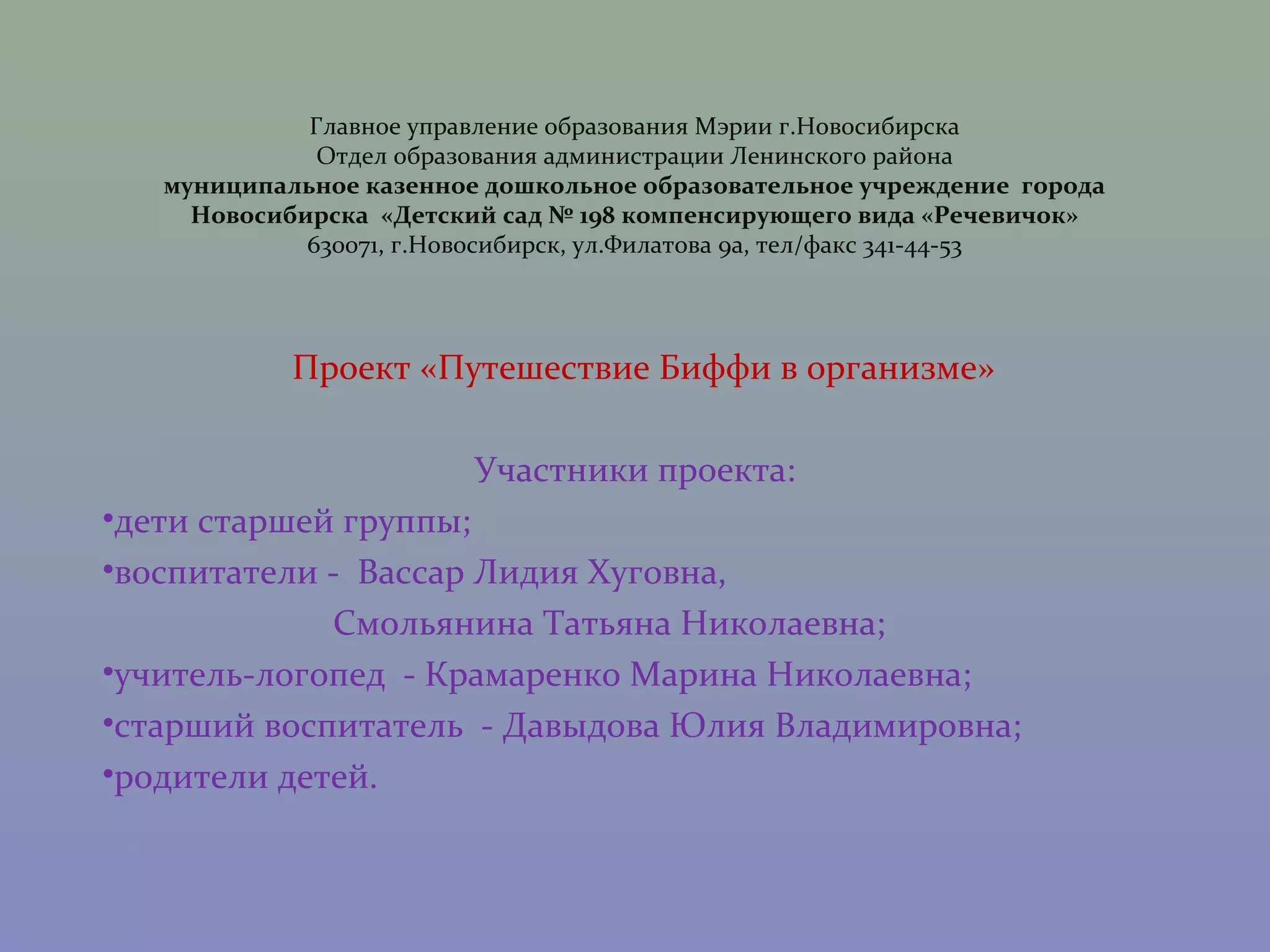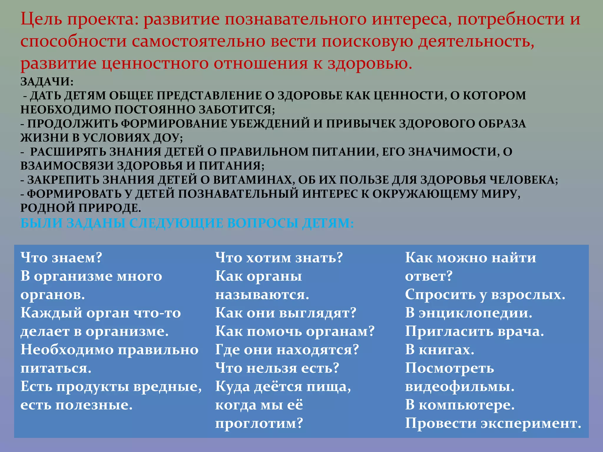 Документ описывает проект детского сада, направленный на развитие познавательного интереса детей к здоровью и правильному питанию. Участники проекта, включая детей, воспитателей и родителей, работают над созданием различных материалов и активностей, таких как игры и театральные постановки. Основные задачи проекта заключаются в формировании здоровых привычек и расширении знаний о здоровье у детей.