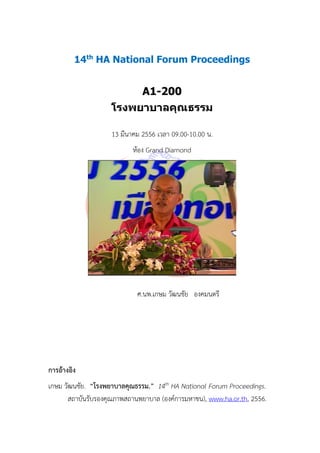 "โรงพยาบาลคุณธรรม" โดย ศ.นพ.เกษม วัฒนชัย องคมนตรี 14th HA National Forum Proceedings 13 มีนาคม 2556 จาก FB อาจารย์ Anuwat Supachutikul