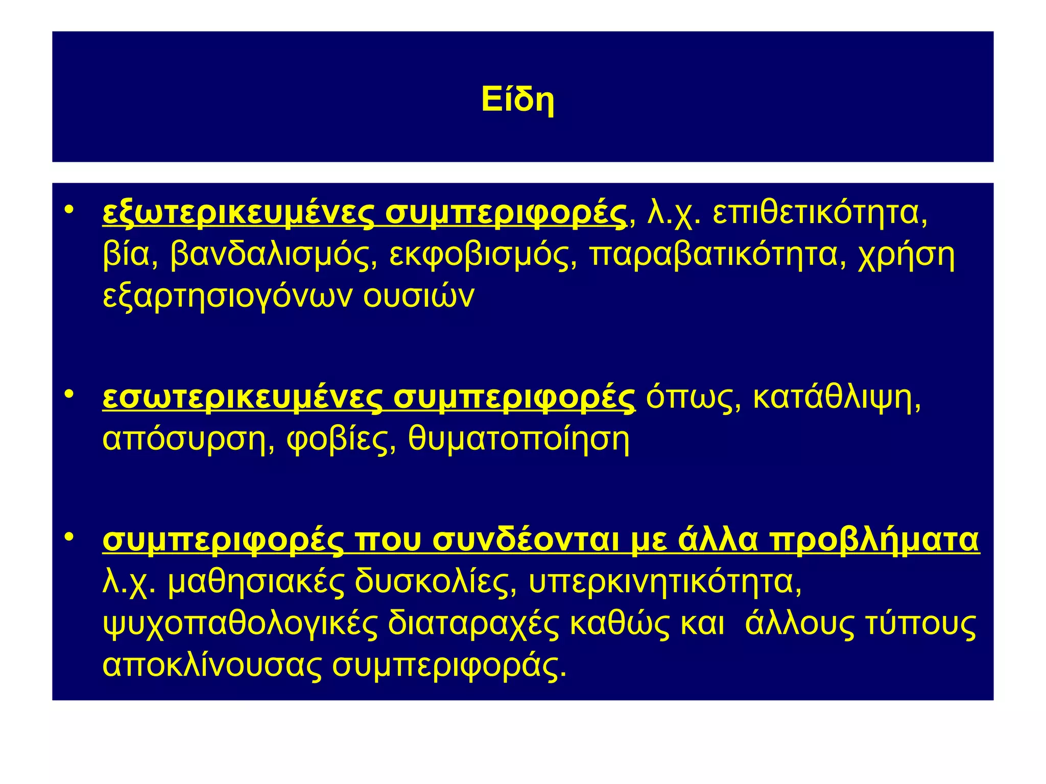 • εξωτερικευμένες συμπεριφορές,λ.χ. επιθετικότητα,