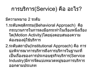 การบริการ ( Service) คือ อะไร ? มีความหมาย 2 ระดับ 1. ระดับพฤติกรรม ( Behavioral Approach ) คือ กระบวนการในการลงมือกระทำในเรื่องหนึ่งเรื่องใด ( Motion Activity ) โดยมุ่งตอบสนองความต้องของผู้ใช้บริการ 2. ระดับสถาบัน ( Institutional Approach ) คือ การมุ่งพิจารณาการบริการถึงการบริการในฐานะที่เป็นเรื่องของการประกอบธุรกิจบริการ ( Service Industry ) มีการจัดแบ่งหมวดหมู่ของการบริการออกตามประเภท - 3.