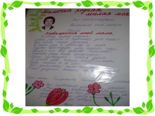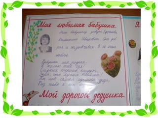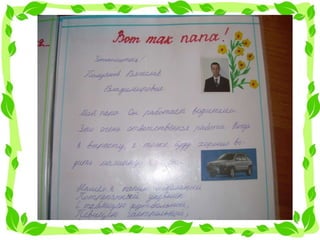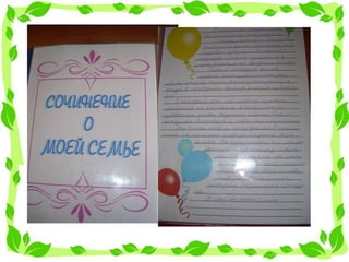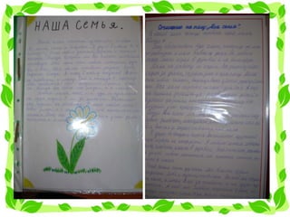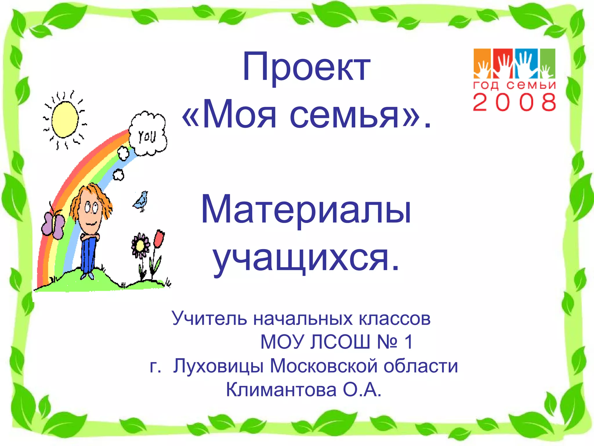 Проект «моя семья» разработан учителем начальных классов О.А. Климантовой и включает этапы написания сочинений, конкурса рисунков и создание презентации о семье. Ученики участвуют в исследовательской работе и сборе материалов, а также в конкурсах на лучшие работы. Итоги проекта будут представленны на выставке и блоге класса.