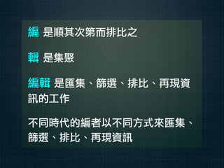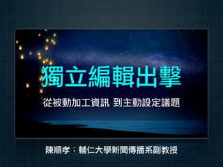 文档讨论了独立编辑在现代信息传播中的角色,包括从被动接收信息到主动创造内容的转变。强调了编辑在信息筛选、意义诠释和故事转译中的重要性,并指出公民在信息爆炸时代的参与与互动。指出需要多重采集和网络编织来应对快速变化的媒体环境。