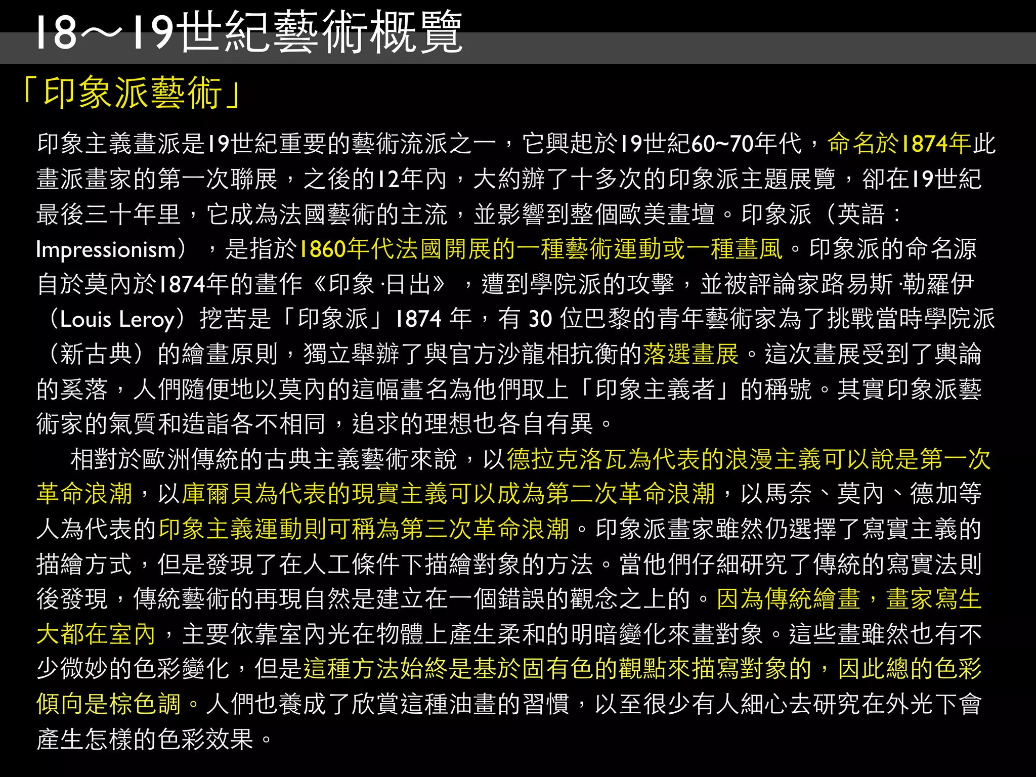 印象派艺术是19世纪重要的艺术流派,从1860年代开始,强调光与色的关系,突破传统艺术的限制,主张在自然中写生。艺术家们例如莫奈、马奈和德加等,运用新科学发现改变了绘画方法,追求色彩的变化与表现而非主题情节。印象派不仅影响了后来的艺术风格,还引发了对绘画形式更深层的探索。