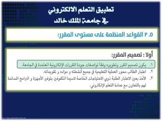 تتناول الوثيقة كفايات متنوعة متعلقة بتصميم وتقديم المقررات الدراسية الإلكترونية، تشمل مهارات تكنولوجيا المعلومات، إدارة المقرر، ووسائل تقييم فعالة. كما تسلط الضوء على أهمية دعم المتعلمين وضمان سهولة الوصول إلى المحتوى التعليمي، وتعزيز تفاعل الطلاب في العملية التعليمية. تُحدد المعايير التي يجب أن تتوافر في المواد التعليمية والتقنيات المستخدمة لتحقيق الأهداف التعليمية المرجوة.