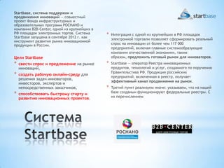 Документ описывает систему поддержки инноваций Startbase, созданную в рамках совместного проекта Роснано и B2B-Center, целью которой является развитие рынка инновационной продукции в России. Система служит платформой для взаимодействия инноваторов, инвесторов и экспертов, предоставляя доступ к федеральным реестрам и организуя экспертные сессии для оценки и акселерации проектов. За первые полгода работы Startbase провела более 8 сессий по всей стране, привлекая более 200 проектных команд и способствуя их выходу на новые уровни развития.