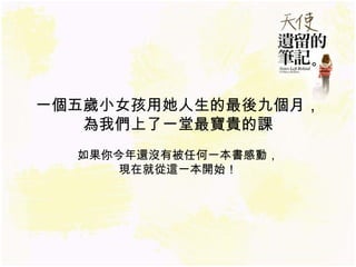 《天使遗留的笔记》讲述了五岁小女孩艾蓮娜与脑癌抗争的真实故事,展现了她在生命最后的日子里,用小纸条传递爱与希望。尽管生命短暂,艾莲娜的勇气和智慧深深感动了无数读者,促使人们珍惜生命和亲情。书中融合了父亲的视角,带来深刻的反思与感动。