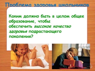 Документ обсуждает важность здоровья школьников и необходимость формирования здорового образа жизни через общее образование. Программа здоровья нацелена на укрепление здоровья обучающихся и создание здоровьесберегающей среды, подчеркивая, что здоровье зависит от образа жизни, наследственности и окружающей среды. Акцентируется внимание на роли семьи в воспитании ответственных будущих родителей и необходимости проведения лекций и практических занятий по основам здорового образа жизни в школе.