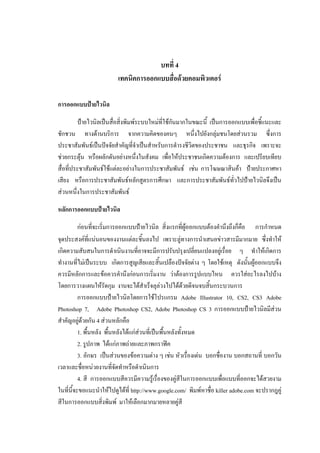 78 โปสเตอรแสดงผลงานทางวิชาการ มีการจัดวางแบบเนนผลงานรูปภาพอยูบนแลวแบงดานลางเปน สองสวน กําหนดใหรูปอยูดานซายทั้งหมด และอักษรอยูดานขวาทั้งหมด เทคนิคการออกแบบปกสื่อสิงพิมพ ่ การออกแบบปกสิ่งพิมพ เปนการออกแบบที่นํารูปภาพและงานกราฟคมาประกอบกัน โดย ใชหลักการออกแบบ เรื่องของจุด เสน สี รูปราง รูปทรง ในการออกแบบปกหนังสือเราใชทั้ง ภาพประกอบไดหลายแบบ เชน รูปถาย ( Photograph) ภาพวาด (Illustrate) หรือภาพที่ตกแตงมาจาก คอมพิวเตอร ตัวอักษร ขอความ นํามาจัดวางใหไดรปแบบที่เหมาะสมดึงดูดความสนใจ สะดุดตา ู เปนที่จดจําไดงาย นาอาน นาสนใจ จนอยากหยิบขึนมาดู ้ ออกแบบปกหนังสือตําราเรียน เปนการออกแบบตามเนื้อหาใหสอดคลองกันกับปกหนังสือ ปกหนังสือสวนมากจะเปนรูปแบบของการออกแบบกราฟค ภาพถาย หรือภาพวาด เปนสวนใหญ ปกหนังสือ ตําราเรียน จะเนนหัวเรื่องเปนหลัก สวนรูปภาพประกอบสวนใหญก็นํามาจากเนื้อเรื่อง ในตําราเรียนนั่นเอง ตัวอยางปกตําราเรียน ปกหนา ปกหลัง ภาพ 4.46 การออกแบบปกตําราเรียน