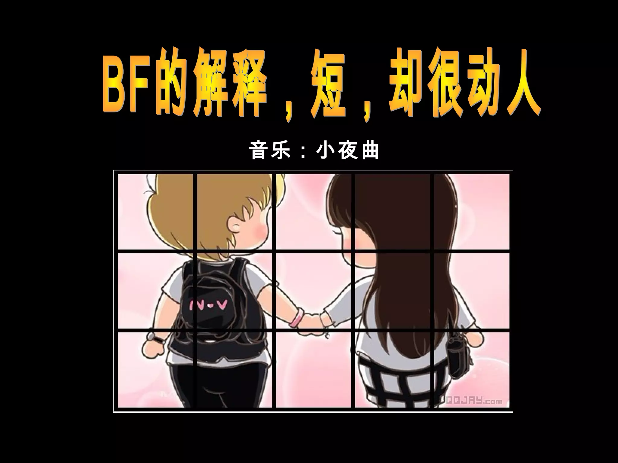 文档通过几个简单的对话展示了“bf”这一词汇在不同人生阶段的含义,从男朋友、最佳朋友到孩子的父亲,最后演变为永恒的爱。每个阶段均以温暖的语言描绘了情侣和夫妻之间的情感发展。最终,‘bf’不仅是一个简称,更成为了深厚情感的象征。