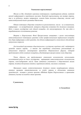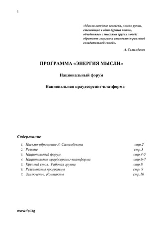 Документ описывает программу 'Энергия мысли', инициированную Фондом прогрессивных инициатив для сбора и продвижения идей кыргызстанцев по общественно значимым вопросам на единой краудсорсинг-платформе. Программа включает в себя национальный форум, круглые столы и возможность участия активных граждан в разработке решений для улучшения общества. Основная цель состоит в консолидации интеллектуального потенциала и выработке коллективных рекомендаций для государства и общества.