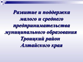 Документ описывает развитие и поддержку малого и среднего предпринимательства в Троицком районе Алтайского края, подчеркивая его важность для улучшения социально-экономической ситуации. Программа на 2011-2013 годы включает различные меры по улучшению условий для ведения бизнеса, такие как расширение доступа к финансовым ресурсам и развитие предпринимательской инфраструктуры. Основные задачи программы направлены на стимулирование занятости, устранение административных барьеров и поддержку молодежного предпринимательства.