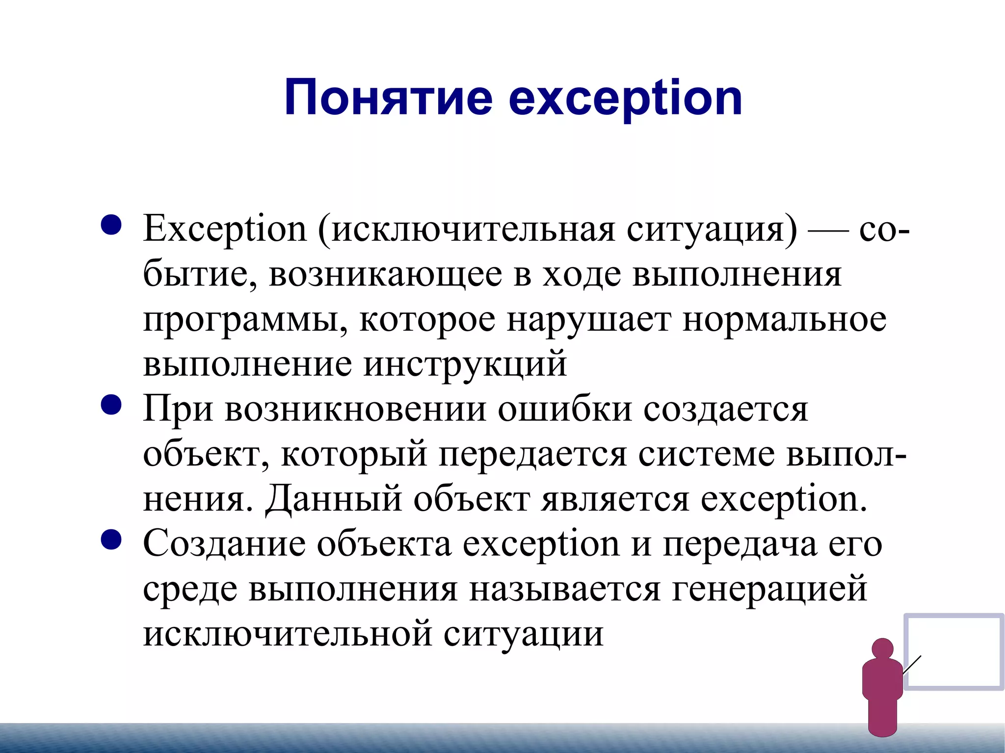 Документ описывает концепцию исключительных ситуаций (exception) в языке Java, включая их создание и обработку через генерацию объектов исключений. Обсуждаются различные типы исключений, такие как обрабатываемые исключения, ошибки и исключения времени выполнения, а также механизмы перехвата и передачи исключений с помощью блоков try/catch. Важно отметить, что для создания пользовательских классов исключений используется класс exception и в документе приведены примеры кода для лучшего понимания обработки ошибок.