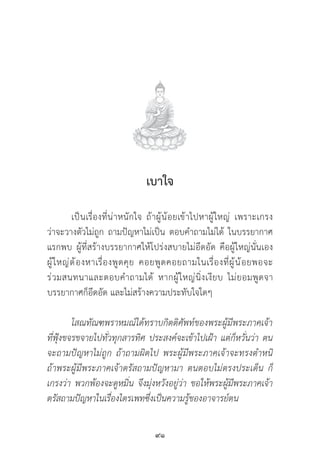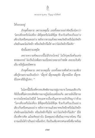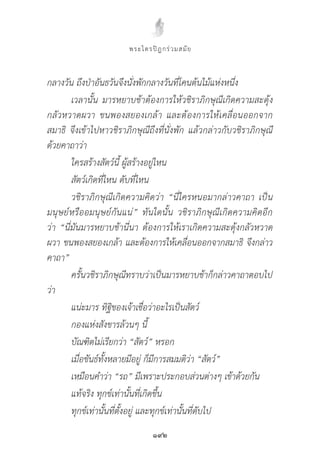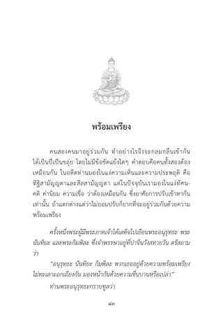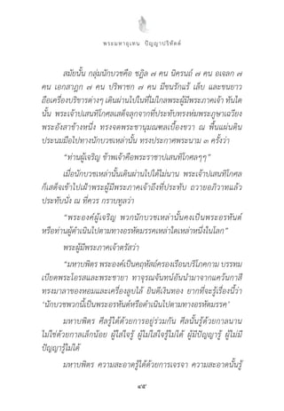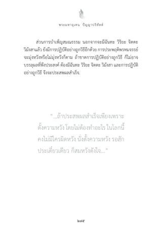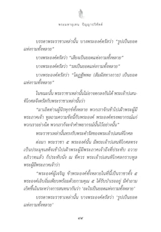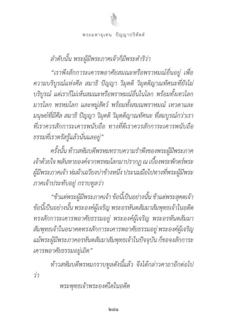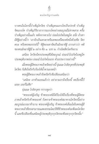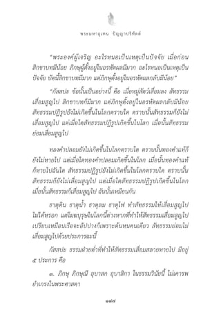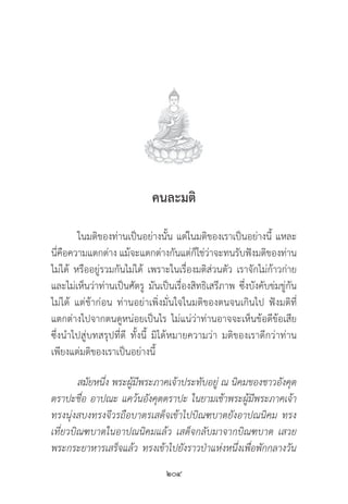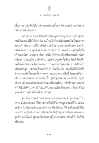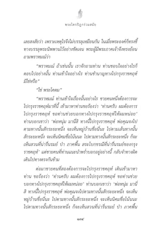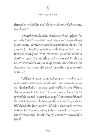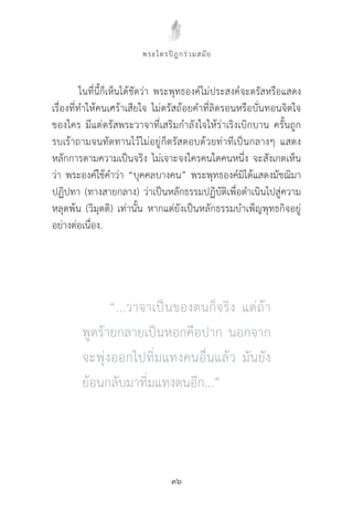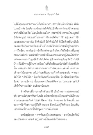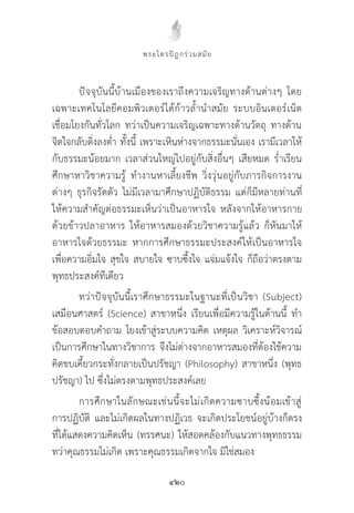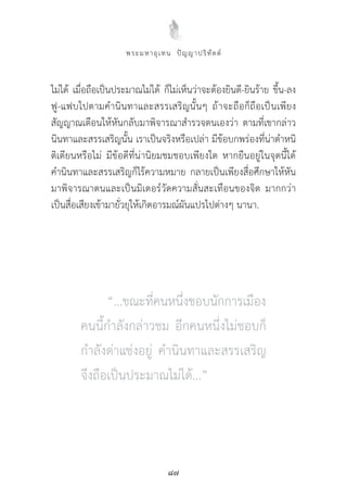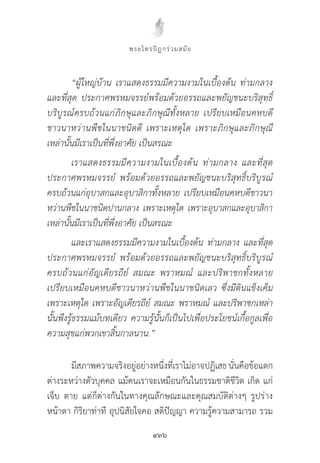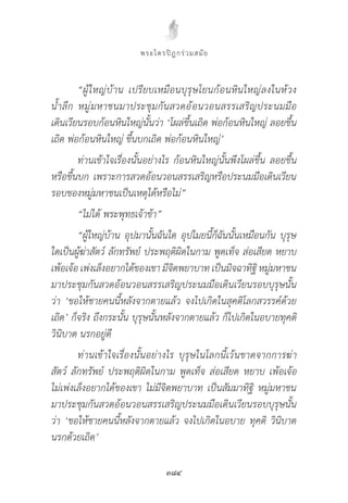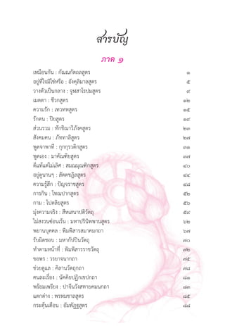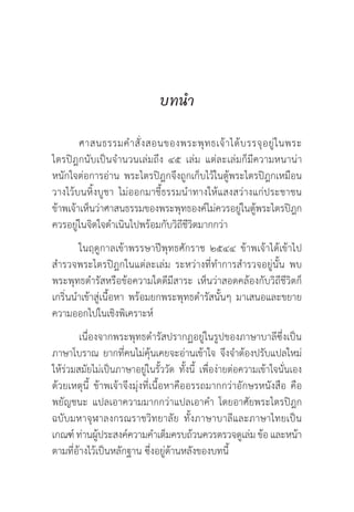 “ท่ามกลางกระแสทุนนิยมที่แปรปรวน ท่ามกลางกระแสธรรมะ แนวใหม่ (อินเทรนด์) และธรรมะประยุกต์ที่กำ�ลังได้รับความนิยมมาก ขึ้นเรื่อยๆ นั้น พระไตรปิฎกร่วมสมัยนี้จะดำ�รงอยู่ได้นานเพียงใดหนอ” แต่ครั้นล่วงถึงปัจจุบันวันนี้ปีพุทธศักราช ๒๕๕๔ พระไตรปิฎก ร่วมสมัย ซึ่งเป็นธรรมะแนวเก่า ขอเรียกว่า “ธรรมะในระบบ” ยึดโยง อยูกบพระไตรปิฎกก็พสจน์ให้เห็นว่า สามารถ “ดำ�รง” อยูได้ และพร้อม ่ั ิู ่ จะยืนหยัดอยู่คู่พระศาสนาต่อไป “พระไตรปิฎกร่วมสมัย ๑-๓” ที่ออกเผยแพร่มาเป็นเวลายาว นานนั้น เพื่อให้ดำ�รงมั่นคงมากยิ่งขึ้นไม่แยกส่วนออกจากกัน จึงเรียง มาอยู่ในเล่มเดียวเป็น “ฉบับไตรภาค” ดังที่เห็นปรากฏนี้ อาตมภาพในฐานะผู้นำ�พุทธวจนะจากพระสูตรต่างๆ มาร้อย เรียงอักษรภาษาสำ�เร็จเป็นรูปเล่มหนังสือก็ให้เกิดความรู้สึกปีติยินดียิ่ง ยินดีวา “พุทธศาสนิกชนยังนิยมธรรมะจากพระไตรปิฎก ยินดีกบธรรมะ ่ ั ในระบบอยู่” ระตะนัตยานุภาเวนะ ด้วยอานุภาพแห่งคุณพระศรีรัตนตรัย ขอให้หนังสือ “พระไตรปิฎกร่วมสมัย” ฉบับไตรภาคนี้ จงส่องสว่างเป็น ประทีปธรรมนำ�ทางสร้างสันติสุขความสงบร่มเย็นให้แก่พุทธศาสนิกชน ตลอดกาลนาน “เอหิปัสสิโก” ทองแท้ทนพิสูจน์ต่อทุกสายตา. ด้วยความเคารพธรรม พระมหาอุเทน ปัญญาปริทัตต์ วัดชนะสงคราม ’ ๕๔