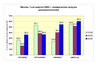 Документ анализирует состояние рынка наружной рекламы в Москве на 2009 год, прогнозируя сокращение на 30% и более из-за экономического кризиса, особенно в ключевых сегментах, таких как банки, недвижимость и ритейл. Приводятся данные о сокращении расходов рекламодателей и анализируются изменениия в структуре рынка по типам рекламодателей и категориям. Также рассматривается необходимость адаптации в условиях спада и рекомендации от экспертов в области массовых коммуникаций.