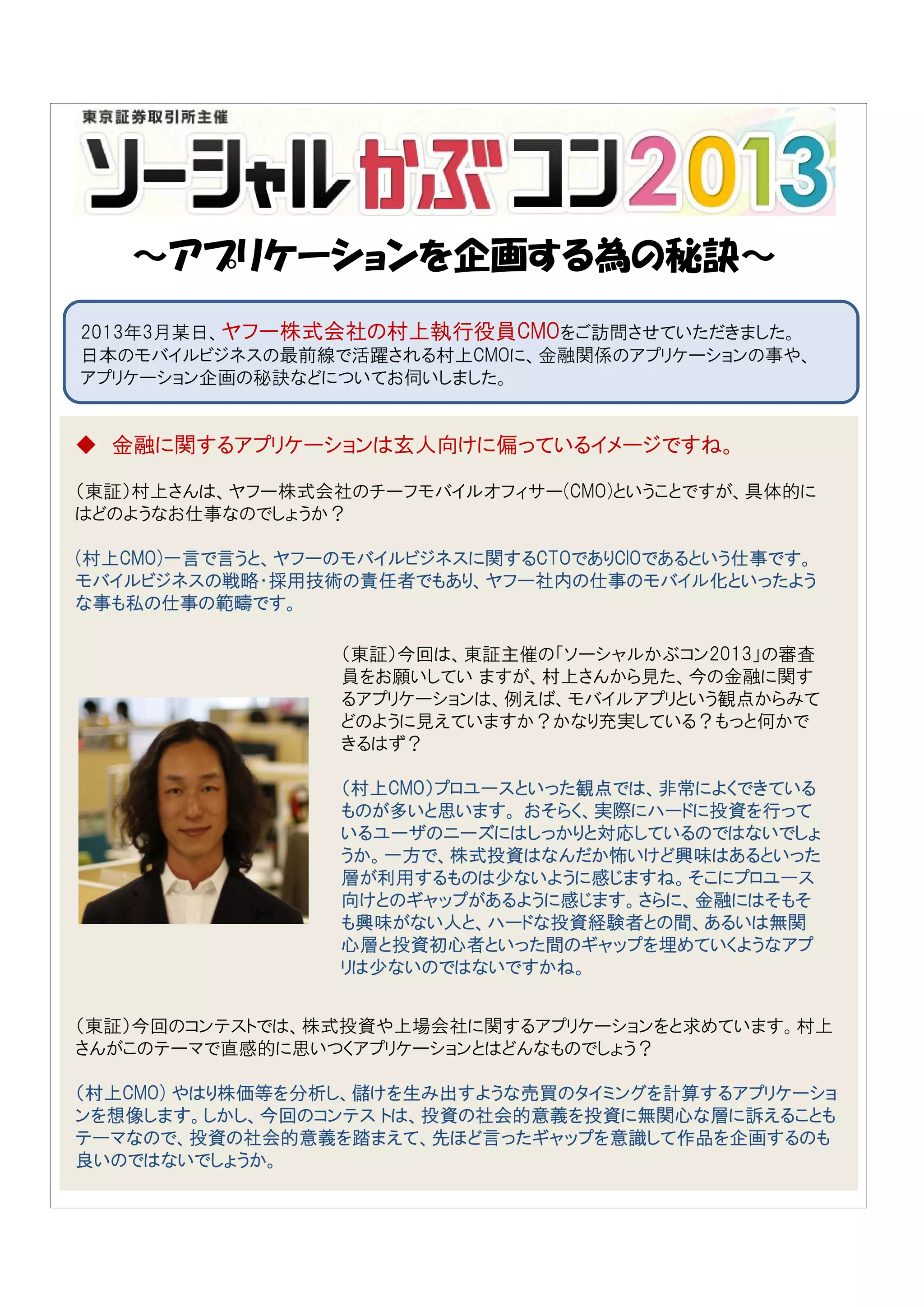 (東証)今回は、東証主催の「ソーシャルかぶコン2013」の審査 員をお願いしてい ますが、村上さんから見た、今の金融に関す るアプリケーションは、例えば、モバイルアプリという観点からみて どのように見えていますか?かなり充実している?もっと何かで きるはず? (村上CMO)プロユースといった観点では、非常によくできている ものが多いと思います。 おそらく、実際にハードに投資を行って いるユーザのニーズにはしっかりと対応しているのではないでしょ うか。一方で、株式投資はなんだか怖いけど興味はあるといった 層が利用するものは少ないように感じますね。そこにプロユース 向けとのギャップがあるように感じます。さらに、金融にはそもそ も興味がない人と、ハードな投資経験者との間、あるいは無関 心層と投資初心者といった間のギャップを埋めていくようなアプ リは少ないのではないですかね。 (東証)今回のコンテストでは、株式投資や上場会社に関するアプリケーションをと求めています。村上 さんがこのテーマで直感的に思いつくアプリケーションとはどんなものでしょう? (村上CMO) やはり株価等を分析し、儲けを生み出すような売買のタイミングを計算するアプリケーショ ンを想像します。しかし、今回のコンテス トは、投資の社会的意義を投資に無関心な層に訴えることも テーマなので、投資の社会的意義を踏まえて、先ほど言ったギャップを意識して作品を企画するのも 良いのではないでしょうか。