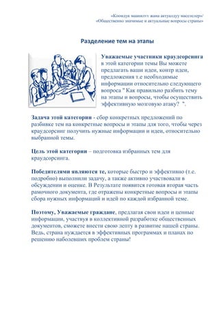 Документ посвящен важности краудсорсинга для сбора идей и предложений по разделению общественно значимых тем на этапы и вопросы. Участников призывают активно вносить свои мысли для создания рамочного документа, который будет содержать конкретные вопросы и этапы для обсуждения. Цель заключается в подготовке эффективных программ и планов для решения актуальных проблем страны.
