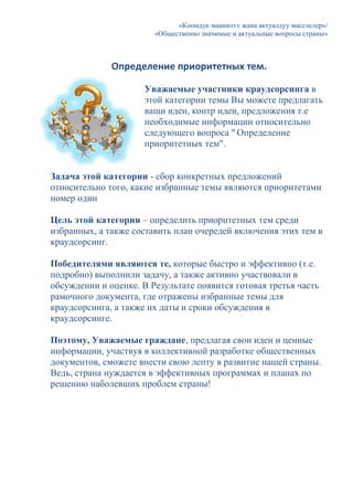 Документ посвящен краудсорсингу по определению приоритетных тем для решения актуальных вопросов страны. Участникам предлагается вносить идеи и предложения, чтобы сформировать план обсуждения важных тем. Цель заключается в создании третьей части рамочного документа с избранными темами и сроками их обсуждения.