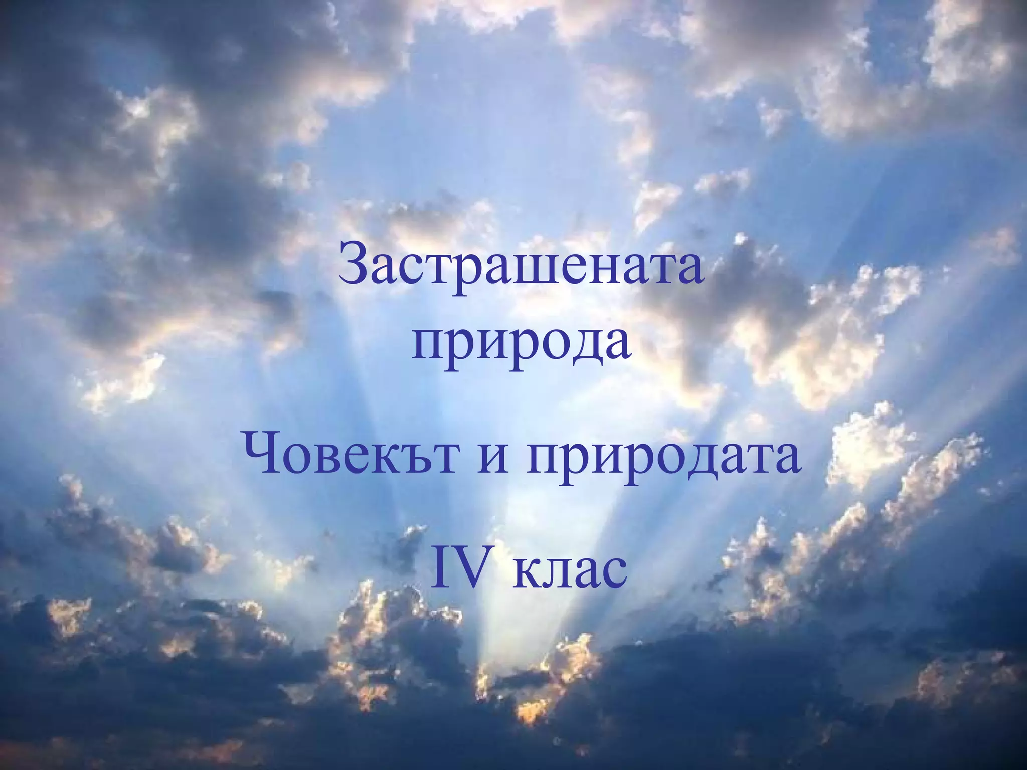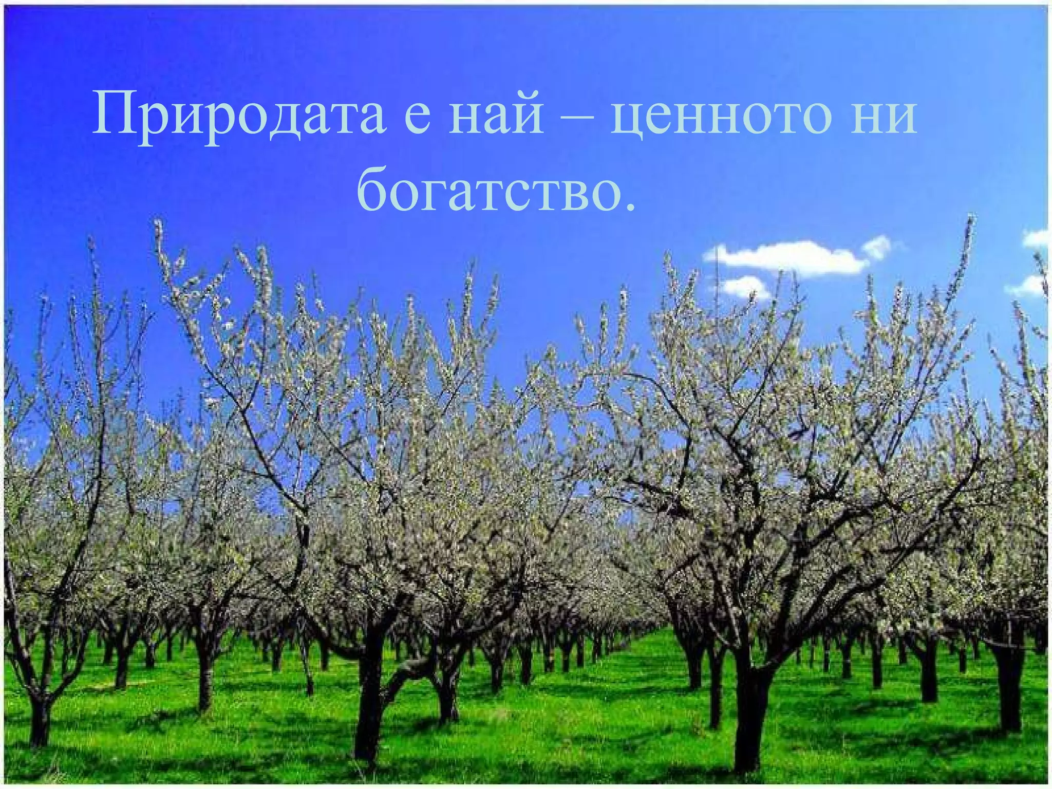 застрашената природа 1. 2. 3. 4. 5. 6. 7. 8. 9. 10. 11. От почвата, тези вещества попадат в храната на животните и човека и предизвикват заболявания. 12. 13. Оттам те могат да попаднат във въздуха и в почвата, когато се напоява със замърсени води. 14. 15. 16. 17. 18. 19. 20. 21. 22. 23. 24. 25. Хората все по – често осъзнават необходимостта от опазване на околната среда. 26. Извършват се различни дейности за нейното възстановяване и опазване. Замърсените води се пречистват в изградени за целта станции. След това отново се изливат в реките и могат да се използват за напояване. 27. 28. 29. 30. 31. 32. 33. 34. 35.