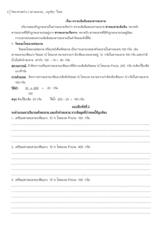 [สารละลาย].....ครูจริยา ใจยศ เรื่อง ความเข้มข้นของสารละลาย ปริมาณของตัวถูกละลายในสารละลายเรียกว่า ความเข้มข้นของสารละลาย สารละลายเข้มข้น หมายถึง สารละลายทีมีตัวถูกละลายปนอยู่มาก สารละลายเจือจาง หมายถึง สารละลายทีมีตัวถูกละลายปนอยู่น้อย ่ การบอกหน่วยของความเข้มข้นของสารละลายเป็นค่าร้อยละดังนีคอ ้ ื 1. ร้อยละโดยมวลต่อมวล ร้อยละโดยมวลต่อมวล หรือเปอร์เซ็นต์ต่อมวล เป็นการบอกมวลของตัวละลายในสารละลาย 100 กรัม เช่น สารละลายเกลือแกง ร้อยละ 10 โดยมวล หมายความว่า มีเกลือแกงละลายอยู่ 10 กรัมในสารละลาย 100 กรัม แสดงว่ามี น้้าเป็นตัวท้าละลาย เท่ากับ 100 - 10 = 90 กรัม สถานการณ์ ถ้าต้องการเตรียมสารละลายเกลือแกงที่มีความเข้มข้นร้อยละ 10 โดยมวล จ้านวน 200 กรัม จะต้องใช้เกลือ แกงกี่กรัม การคานวณ ต้องการสารละลายเกลือแกงเข้มขันร้อยละ 10 โดยมวล หมายความว่าต้องมีเกลือแกง 10 กรัมในสารละลาย 100 กรัม วิธทา ี 10 x 200 = 20 กรัม 100 สรุป ต้องใช้เกลือ 20 กรัม ใช้น้า 200 - 20 = 180 กรัม แบบฝึกหัดที่ 2 จงคานวณหาปริมาณตัวละลาย และตัวทาละลาย จากข้อมูลที่กาหนดให้ถูกต้อง 1. เตรียมสารละลายเกลือแกง 10 % โดยมวล จ้านวน 100 กรัม .................................................................................................................... .............................................................. ............................................................................................................................. ..................................................... ............................................................................................................................. ..................................................... ......................................................................................................................................................... ......................... 2. เตรียมสารละลายเกลือแกง 10 % โดยมวล จ้านวน 400 กรัม .............................................................................................................................................................................................. .............................................................................................................................................................................................. .............................................................................................................................................................................................. .............................................................................................................................................................................................. .............................................................................................................................................................................................. 3. เตรียมสารละลายเกลือแกง 15 % โดยมวล จ้านวน 100 กรัม .............................................................................................................................................................................................. .............................................................................................................................................................................................. .............................................................................................................................................................................................. .............................................................................................................................................................................................. .............................................................................................................................................................................................. ..............................................................................................................................................................................................