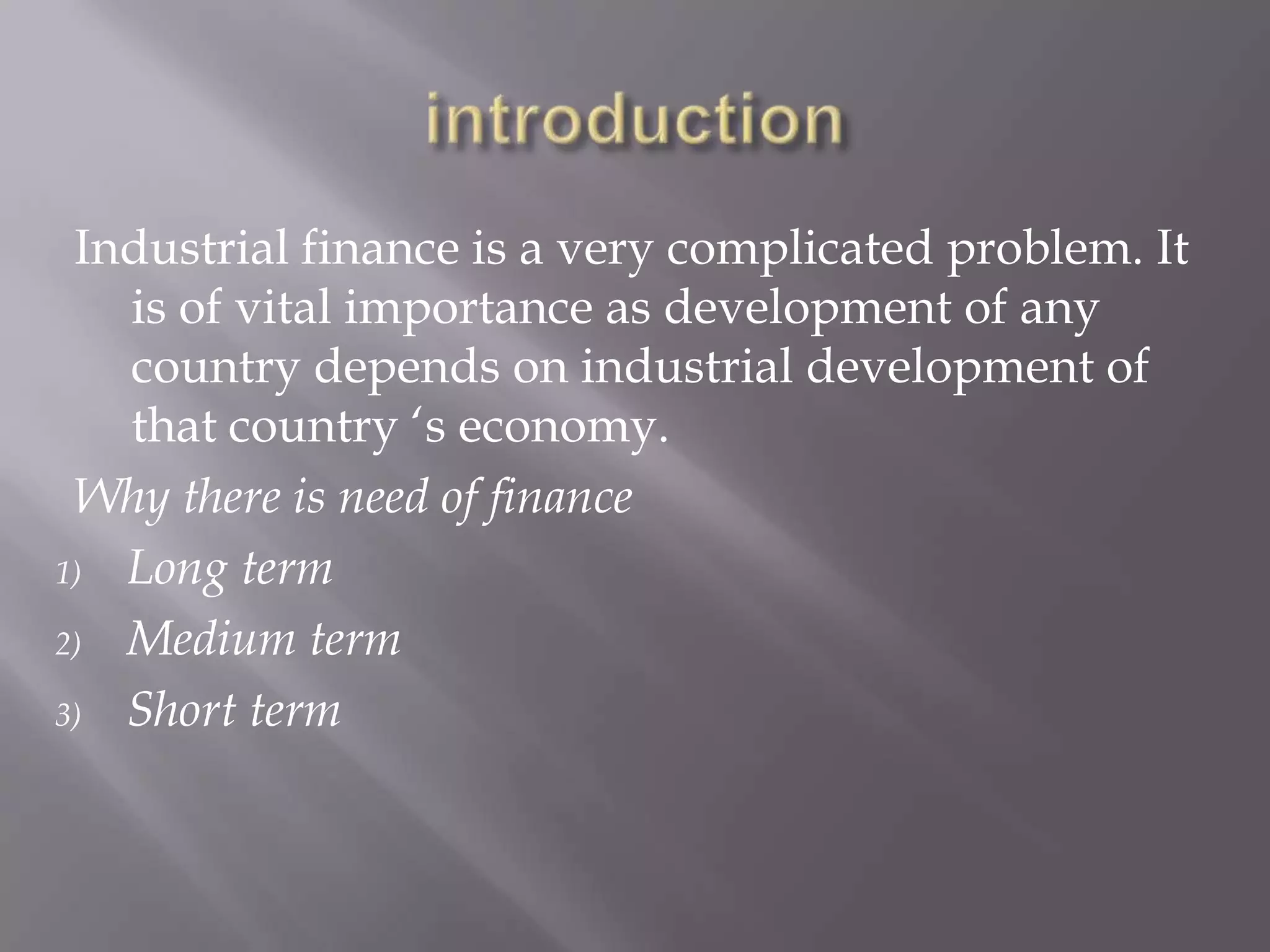 Industrial finance is complex but vital for economic development. Long, medium, and short term capital is needed. Various public and private institutions provide industrial financing in India, including IFCI, IDBI, ICICI, EXIM Bank, NABARD, SIDBI, NHB, LIC, GIC, and UTI. These institutions offer financing options tailored to meet long, medium, and short term capital needs through means like loans, refinancing, and investment.