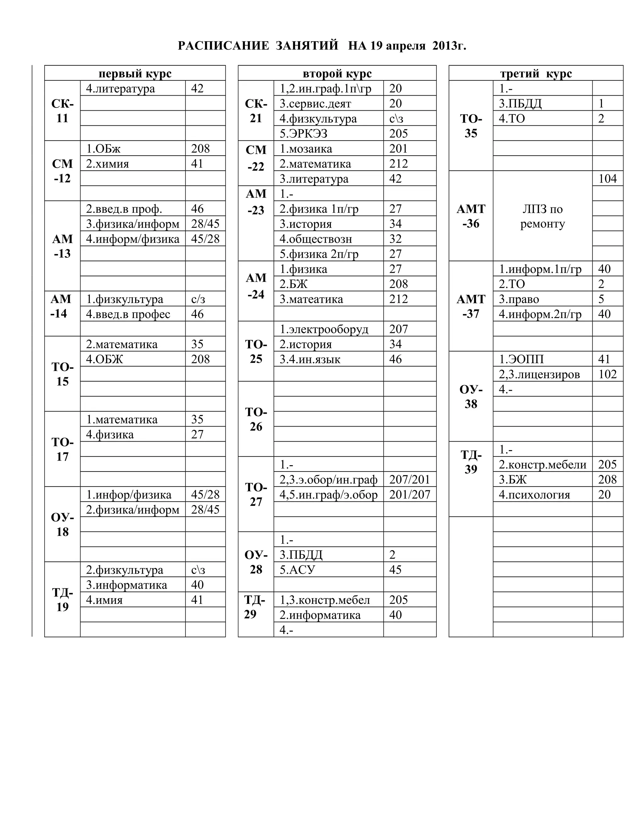 Документ представляет собой расписание занятий на 19 апреля 2013 года для студентов первого, второго и третьего курсов. В нем указаны дисциплины, номера аудиторий и группы, а также время проведения занятий. Расписание охватывает различные предметы, включая литературу, математику, физику, информатику и другие.