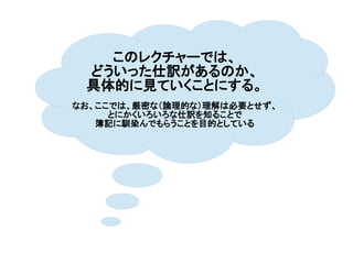 このレクチャーでは、 どういった仕訳があるのか、 具体的に見ていくことにする。 なお、ここでは、厳密な(論理的な)理解は必要とせず、 とにかくいろいろな仕訳を知ることで 簿記に馴染んでもらうことを目的としている