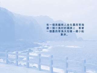 有一個美國商人坐在墨西哥海邊一個小漁村的碼頭上,看著一個墨西哥漁夫划著一艘小船靠岸。