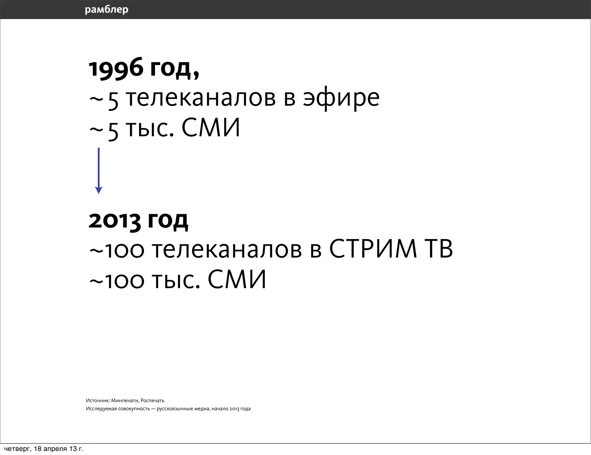 Документ описывает развитие русскоязычных медиаплатформ, в частности, нового Рамблера, который предлагает персонализированный контент и рекомендации для пользователей. Включены результаты тестирования и статистика по аудитории до и после обновления главной страницы, показывающие рост уникальных посетителей и вовлеченности. Также упоминаются ключевые функции новой главной страницы, такие как интеграция с социальными сетями и мобильная версия.