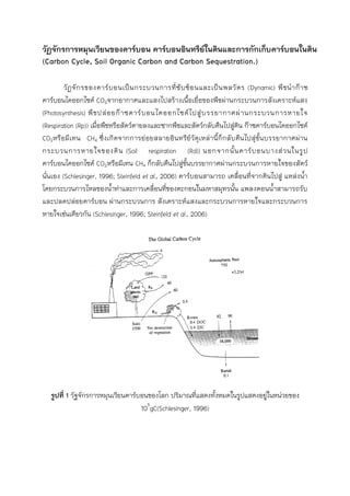 Soil Organic Carbon and Carbon Sequestration.) วั ฏ จั ก รของคาร บ อนเป น กระบวนการที่ ซั บ ซ อ นและเป น พลวั ต ร (Dynamic) พื ช นํ า ก า ซ คารบอนไดออกไซด CO2จากอากาศและแสงไปสรางเนื้อเยื่อของพืชผานกระบวนการสังเคราะหแสง (Photosynthesis) พื ช ปล อ ยก า ซคาร บ อนไดออกไซด ไ ปสู บ รรยากาศผ า นกระบวนการหายใจ (Respiration (Rp)) เมื่อพืชหรือสัตวตายลงและซากพืชและสัตวกลับคืนไปสูดิน กาซคารบอนไดออกไซด CO2หรือมีเทน CH4 ซึ่ง เกิด จากการยอยสลายอิน ทรียวัตุเหลานี้ก็ก ลับคืน ไปสุชั้น บรรยากาศผาน กระบวนการหายใจของดิ น (Soil respiration (Rd)) นอกจากนั้ น คาร บ อนบางส ว นในรู ป คารบอนไดออกไซด CO2หรือมีเทน CH4 ก็กลับคืนไปสูชั้นบรรยากาศผานกระบวนการหายใจของสัตว นั่นเอง (Schlesinger, 1996; Steinfeld et al., 2006) คารบอนสามารถ เคลื่อนที่จากดินไปสู แหลงน้ํา โดยกระบวนการไหลของน้ําทาและการเคลื่อนที่ของตะกอนในมหาสมุทรนั้น แพลงตอนน้ําสามารถรับ และปลดปลอยคารบอน ผานกระบวนการ สังเคราะหแสงและกระบวนการหายใจและกระบวนการ หายใจเชนเดียวกัน (Schlesinger, 1996; Steinfeld et al., 2006) รูปที่ 1 วัฐจักรการหมุนเวียนคารบอนของโลก ปริมาณที่แสดงทั้งหมดในรูปแสดงอยูในหนวยของ 105gC(Schlesinger, 1996)