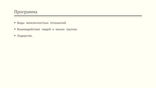 Документ описывает межличностные отношения, их виды и важность в процессе общения и взаимодействия людей. Рассматриваются различные типы отношений, такие как официальные, неофициальные, деловые и личные, а также их влияние на группы и сообщества. Также обсуждаются стили лидерства и факторы, определяющие успешное взаимодействие между людьми в малых группах.