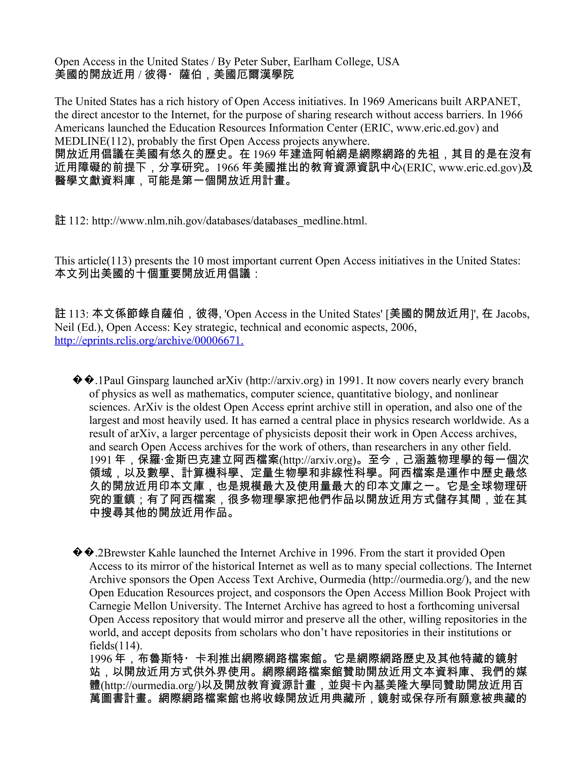 The United States has a rich history of supporting open access to research. Some of the earliest open access projects include ARPANET, the precursor to the Internet, and MEDLINE. Major current open access initiatives in the US include arXiv, an open access archive launched in 1991 that covers many fields of science; the Internet Archive, launched in 1996 to provide open access to web archives and collections; and PLoS, an open access publisher launched in response to the lack of open access from traditional publishers. Many US universities have also adopted open access policies or resolutions.