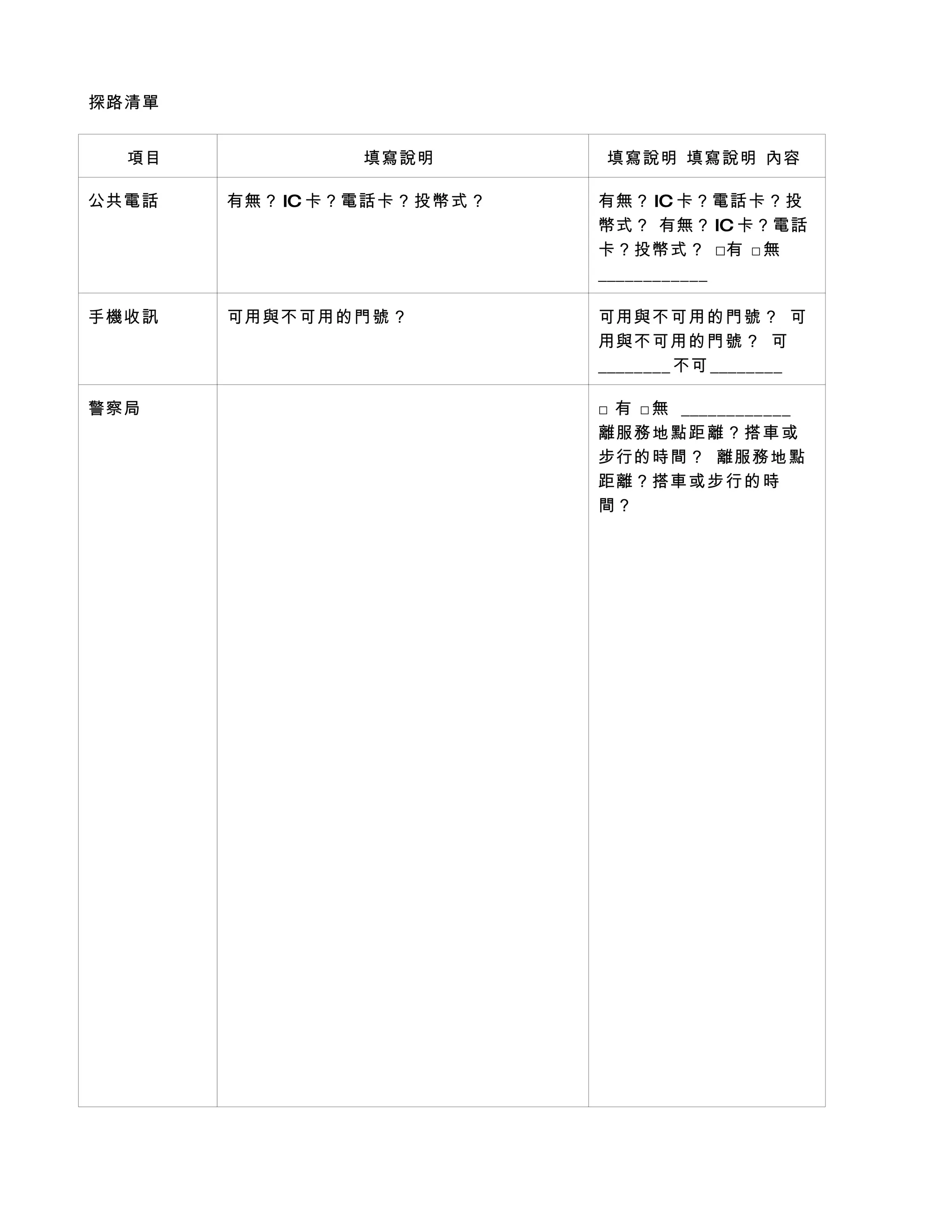 填寫說明 填寫說明 填寫說明 內容 公共電話 有無? IC 卡?電話卡? 投 幣 式 ? 有無? IC 卡?電話卡?投 幣式? 有無? IC 卡?電話 卡?投幣式? □有 □ 無 ____________ 手機收訊 可用與不可用的 門 號 ? 可用與不可用 的 門 號 ? 可 用與不可用的 門 號 ? 可 ________ 不可 ________ 警察局 □ 有 □ 無 ____________ 離服務地點距 離 ? 搭 車 或 步行的時間? 離服務地點 距離?搭車或 步 行 的 時 間?