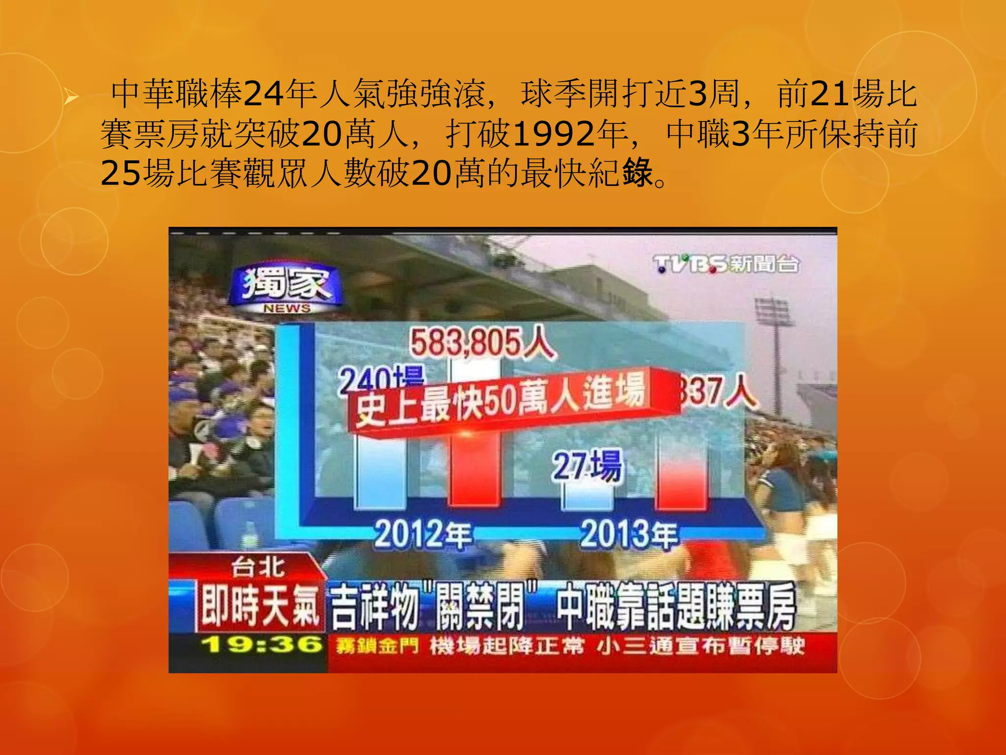 中華職棒24年人氣強強滾,球季開打近3周,前21場比 賽票房就突破20萬人,打破1992年,中職3年所保持前 25場比賽觀眾人數破20萬的最快紀錄。