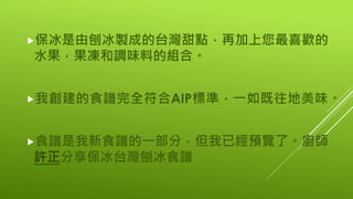 本文件介绍了一种符合AIP标准的台湾刨冰食谱,旨在分享这一清凉甜点的制作方法。文章回忆了作者童年夏季在台湾的美好时光,并强调刨冰作为在炎热天气中消暑的完美选择。作者提供了所需的成分和制作步骤,鼓励根据个人喜好添加不同的水果和冰淇淋。