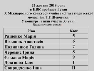 Переможці Кагарлицького НВК І етапу Х Міжнародного конкурсу ім. Т.Г.Шевченка
