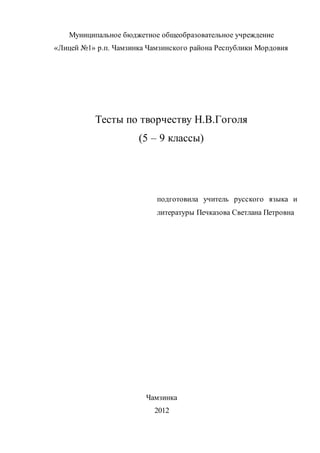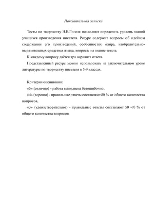 Тесты потворчеству Н.В.Гоголя позволяют определить уровень знаний